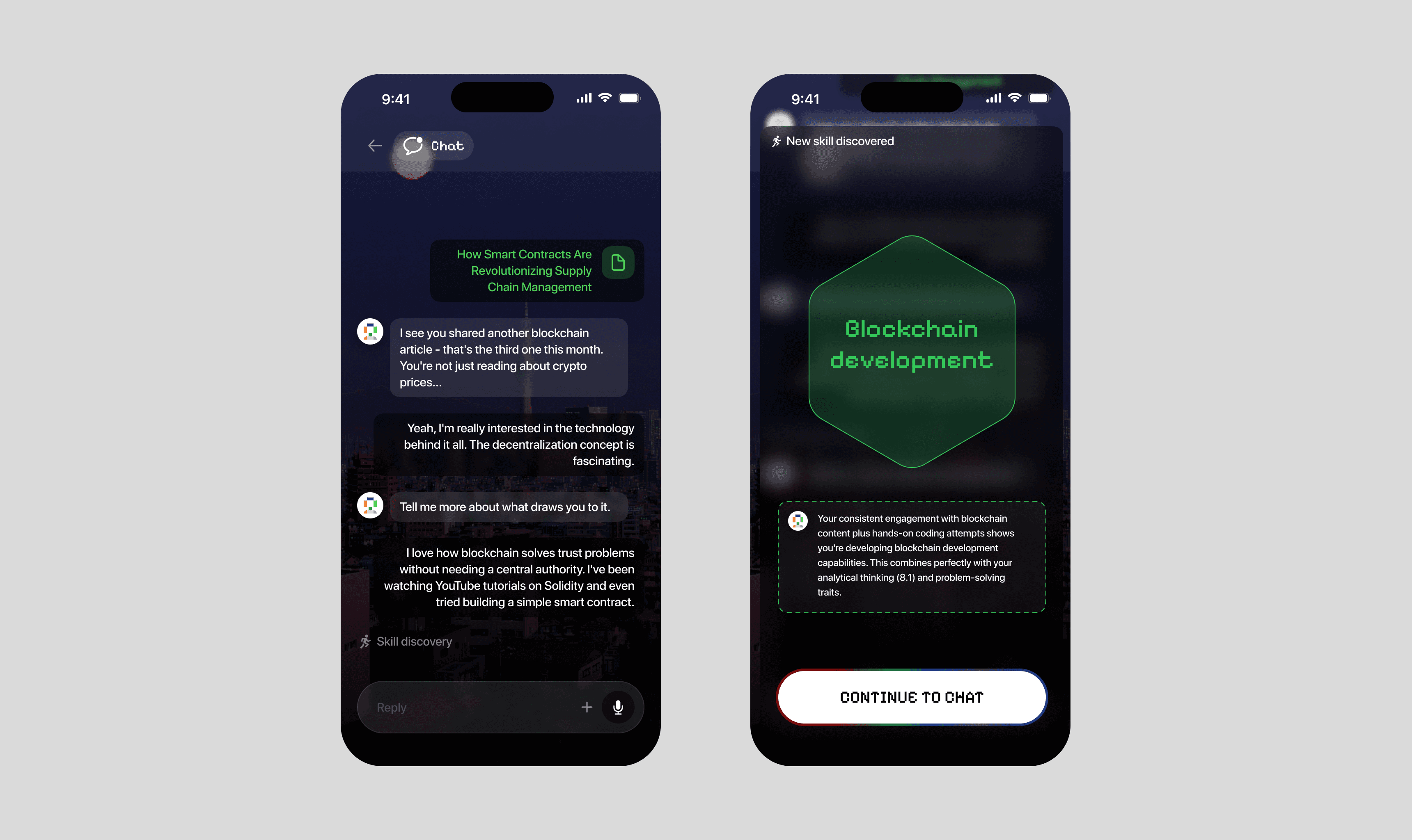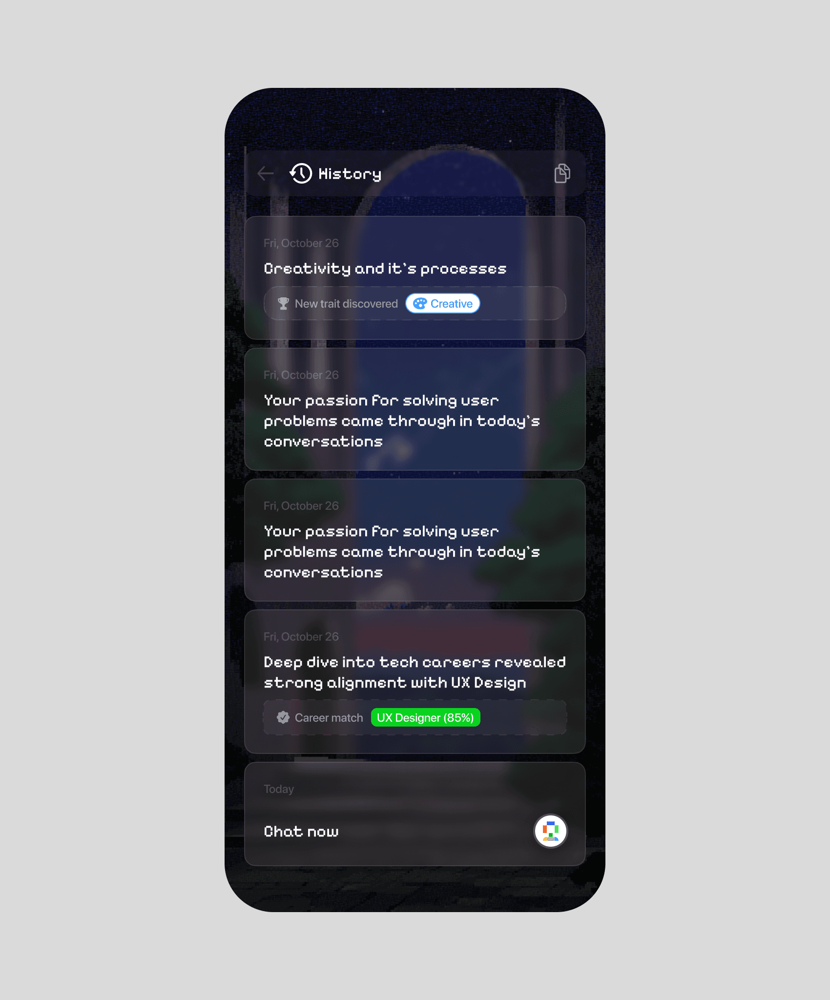 Pixel, an AI agent with a distinct personality that builds rapport with users through natural conversation. Rather than asking direct assessment questions, Pixel engages in casual dialogue about interests, experiences, and aspirations. This approach creates a more relaxed environment where users freely express themselves, leading to more authentic insights about their traits and skills.