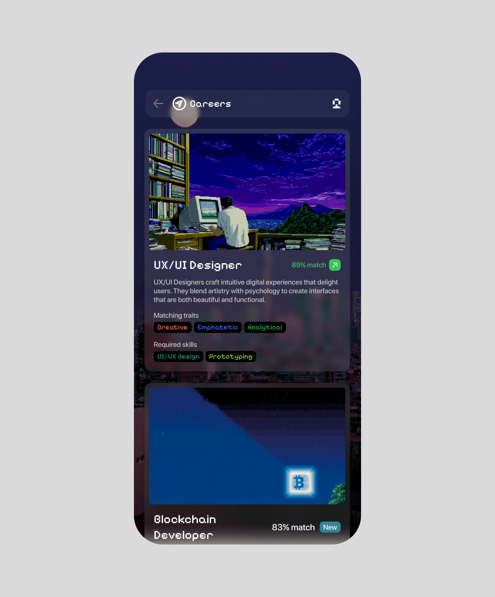 Our challenge was to create an engaging, dynamic career discovery experience that evolves with the user while providing meaningful, actionable insights.