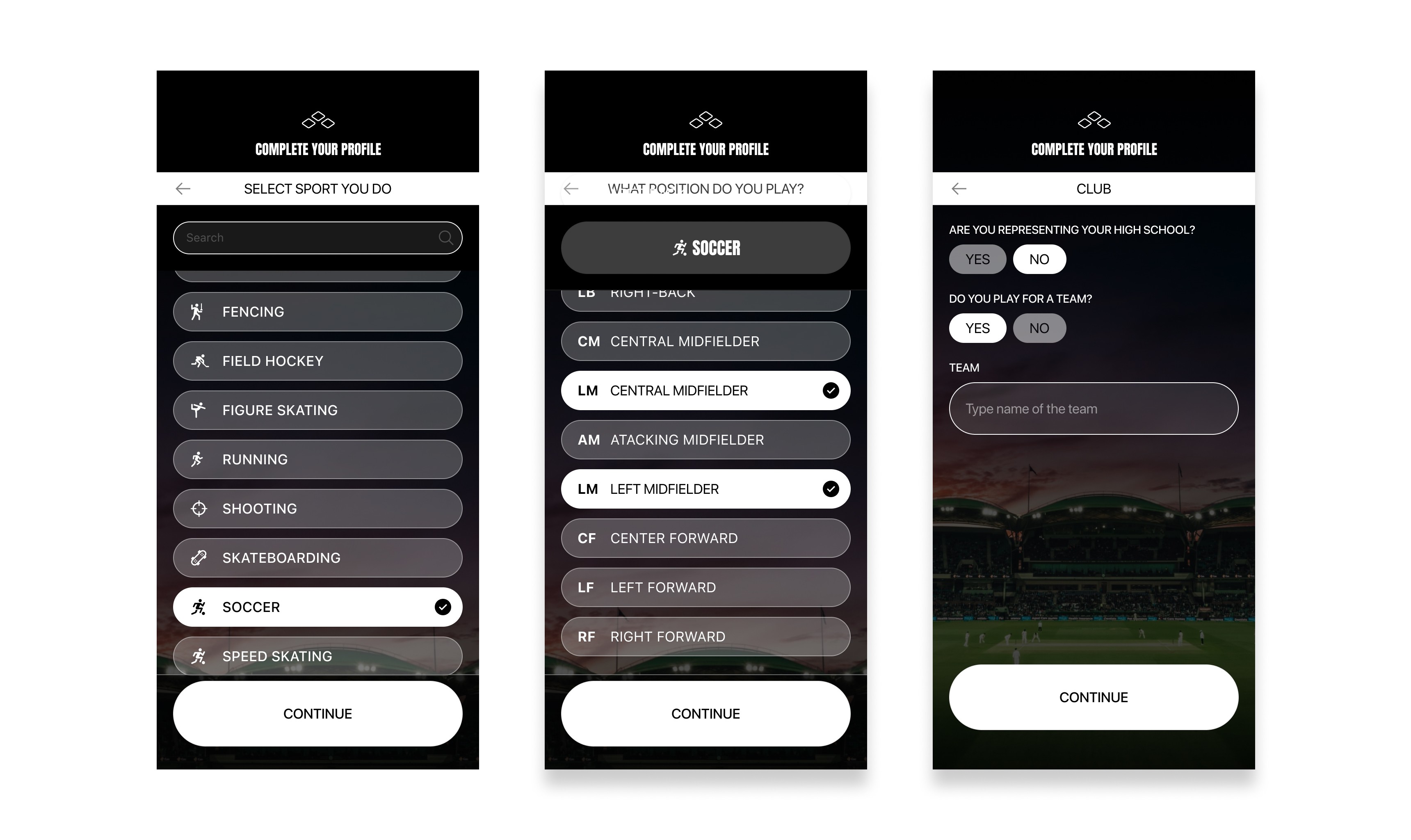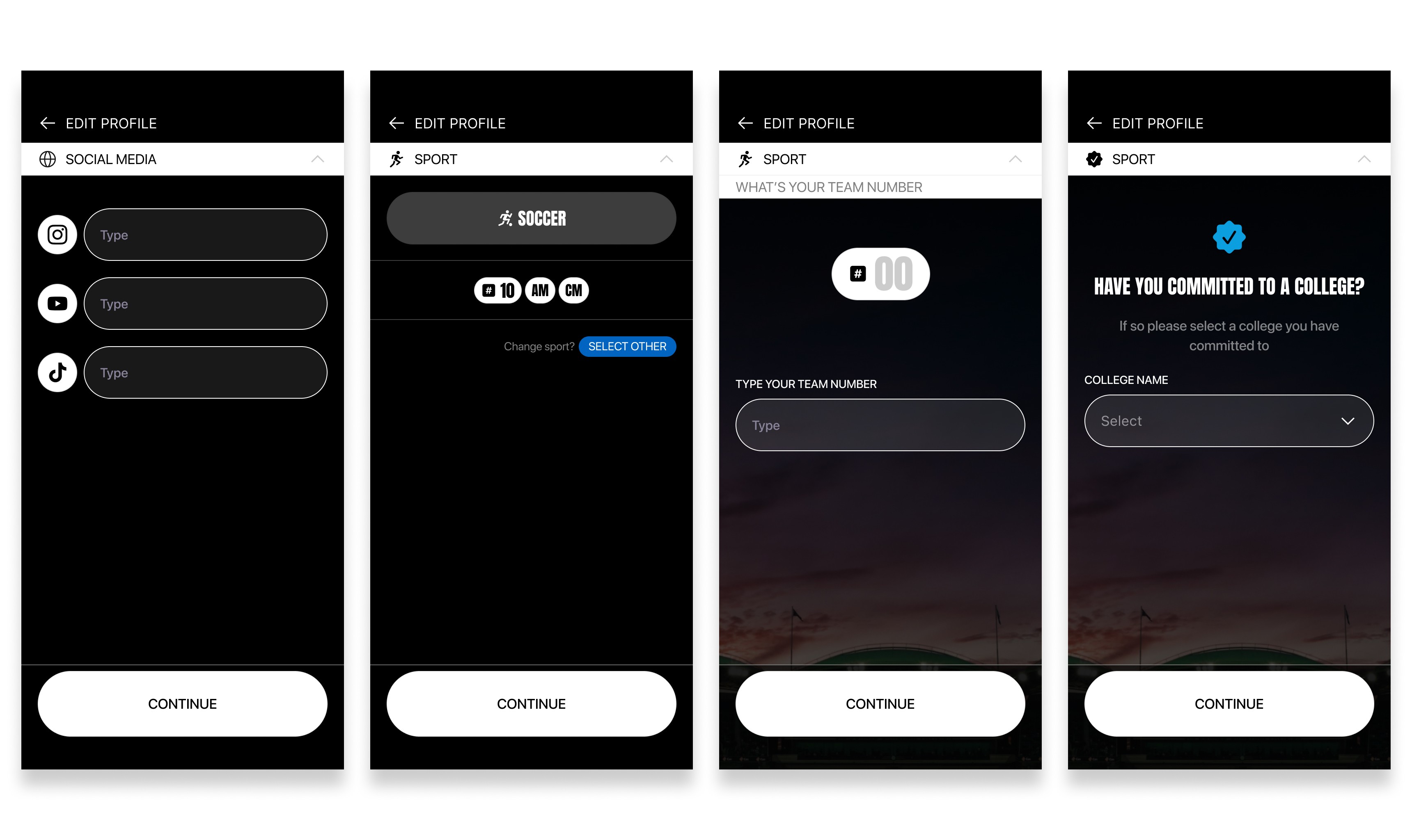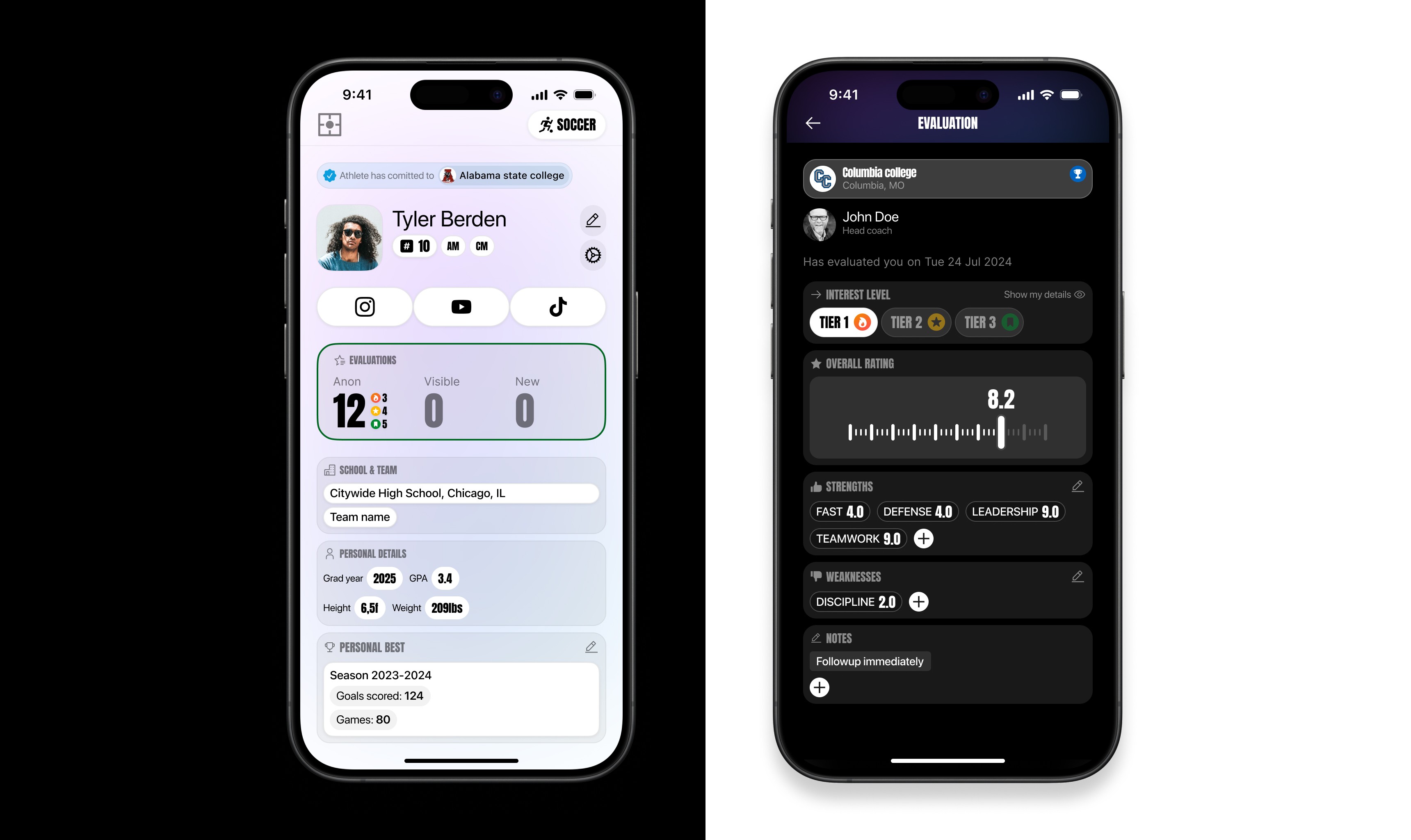 Athlete's key stats, school details, and upcoming moves. Added a simple follow system so coaches can track prospects with one click. The whole recruitment story unfolds on one clean page.