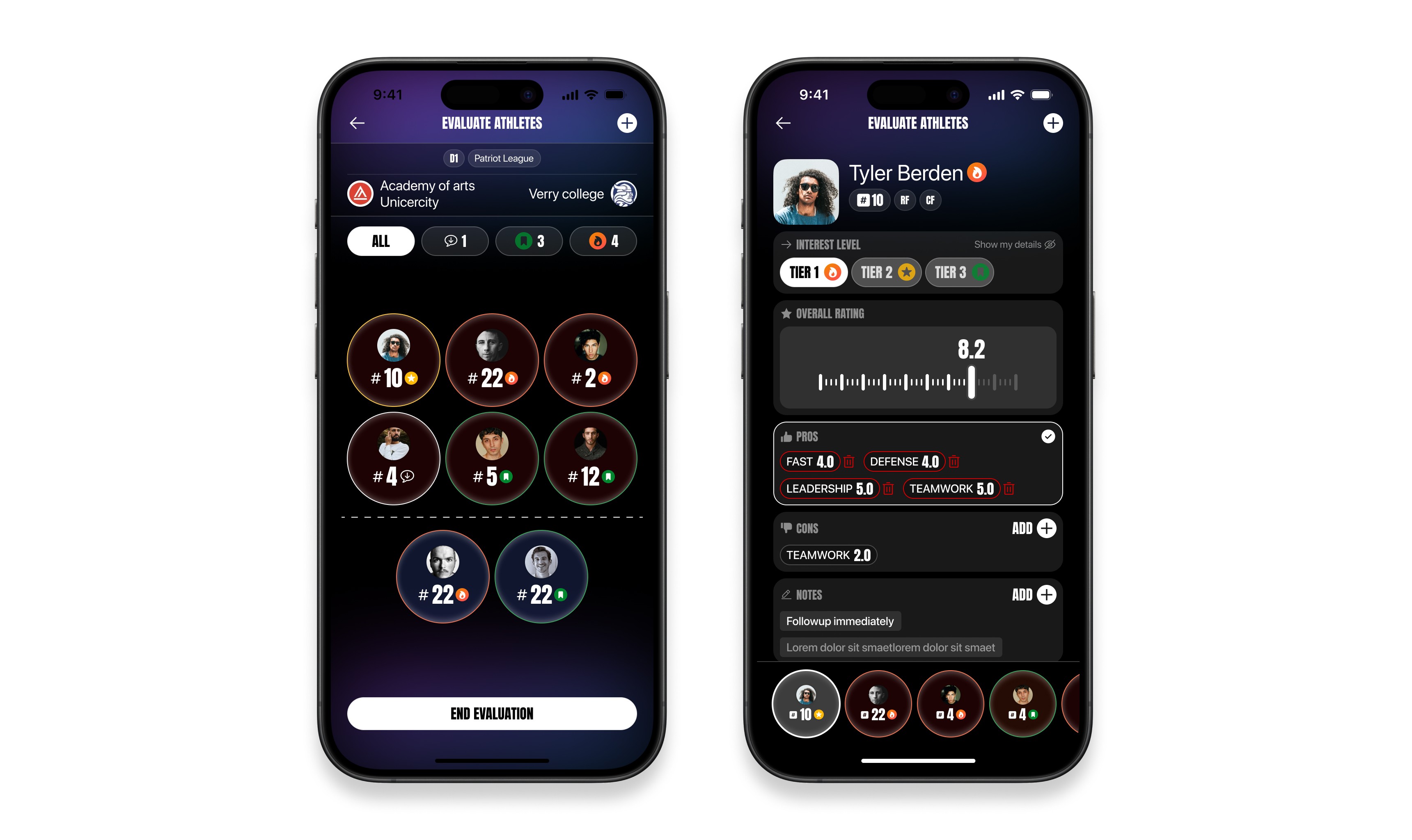 Coaches can evaluate athletes right from their phone while watching them perform. No more scribbling notes or trying to remember who did what.